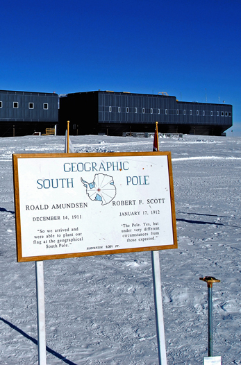 The brief quotations on this sign at the U.S. Amundsen–Scott South Pole Station are from the diaries of Amundsen and Scott soon after they arrived at the Pole, on the dates shown. The silver pole on the right, with the bronze disc on top, marks the geographic South Pole. The main South Pole station building is in the background.