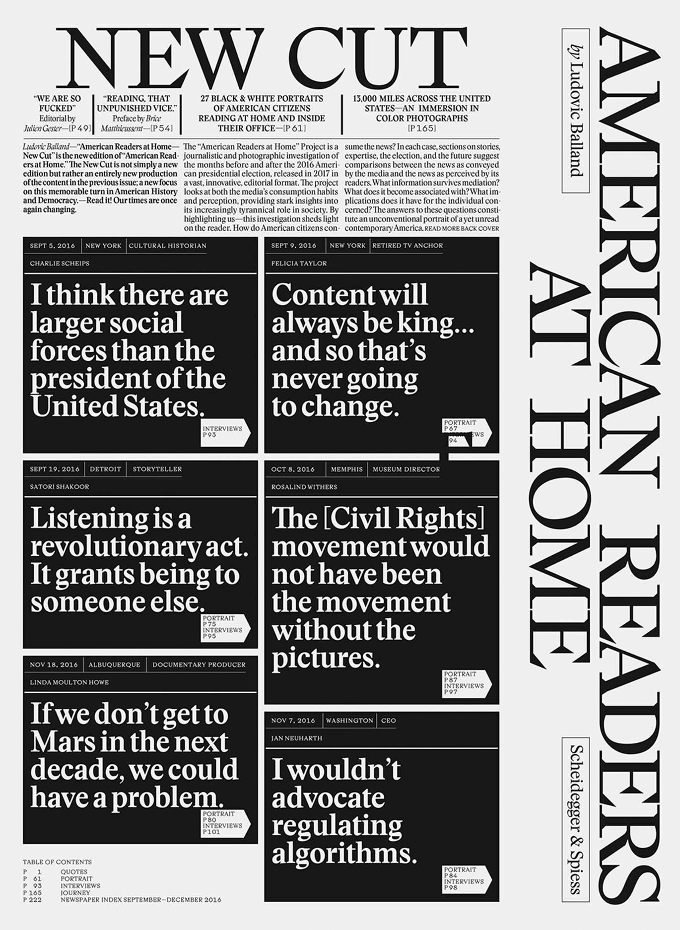 When American Readers at Home was published in early 2018, it was met with widespread praise. Swiss graphic designer and photographer Ludovic Balland has now put together a new selection of the compelling material amassed on his road trip across the United States during the 2016 presidential campaign. American Readers at Home—New Cut brings together color photographs of cityscapes and black-and-white portraits of American citizens with interviews about their use of news media, alongside facsimiles of newspapers, and collages with statements about the current state of the country. Four years have passed, yet none of these stories have lost their power or urgency.