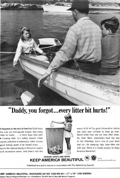 And why had this litter crisis emerged? The Ad Council acknowledged that “more and more products” were now “wrapped and packaged in containers of paper, metal and other materials”—the very same disposable containers that were manufactured, marketed, and used by the very same companies that had founded and directed KAB. Yet rather than critique the proliferation of disposables, rather than question the corporate decisions that led to the widespread use of these materials, KAB and the Ad Council singled out “individual thoughtlessness” as “the outstanding factor in the litter nuisance.”
