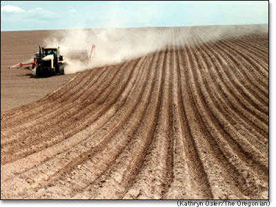 Hutterite farmer Albert Wollman pilots a potato planter through a Columbia Basin field. The spuds will be processed into french fries destined for fast-food outlets in Asia.