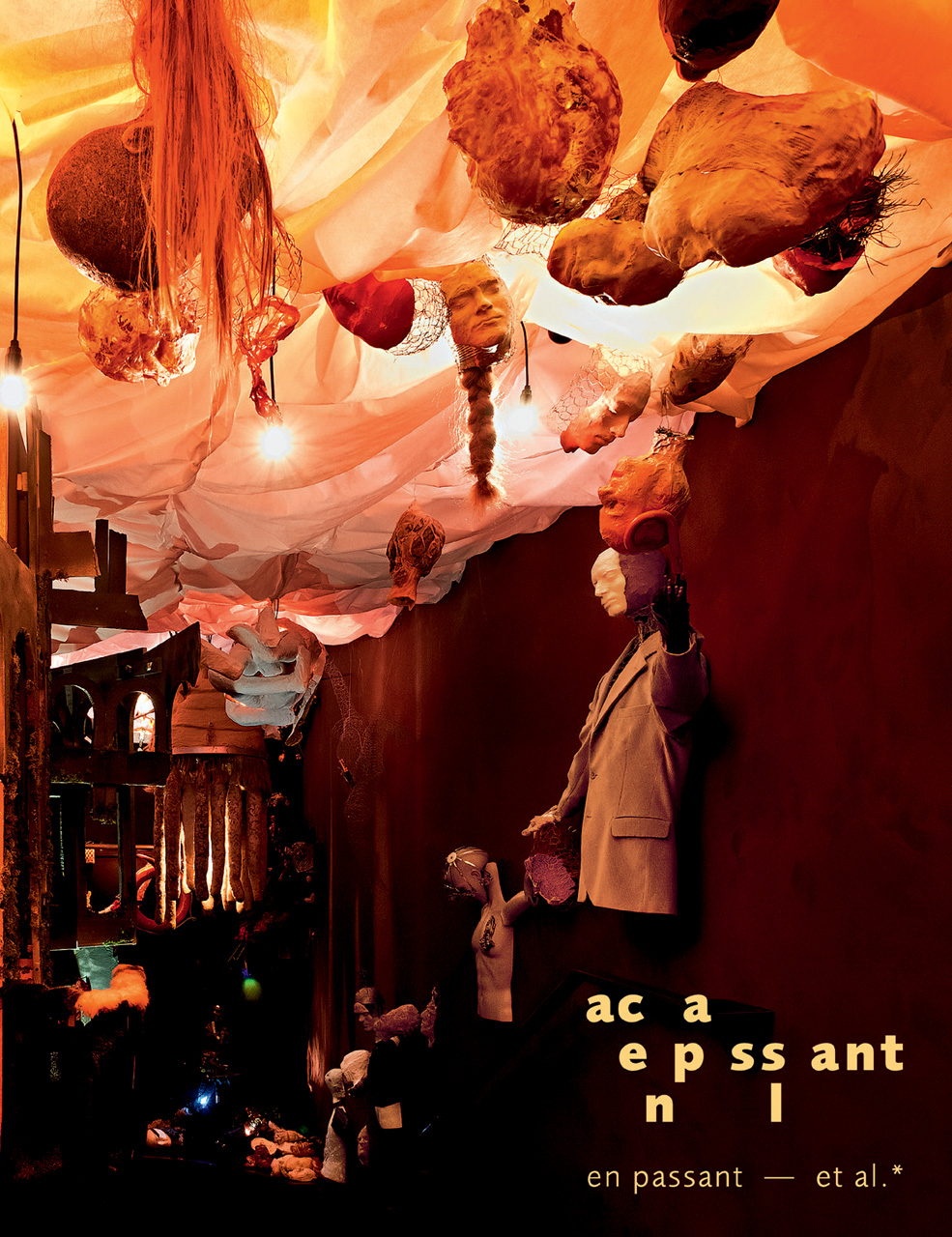 Developed by a young group of artists from New York, Paris, and Frankfurt in collaboration with the Schirn Kunsthalle Frankfurt, the room-filling installation En Passant makes use of unusual lighting, interesting sculptural objects, and sound in order to present a contemporary perspective on surrealism. Included in the installation—and reproduced here in nearly sixty stunning full-page photographs—are a collection of unsettling sculptural works, among them dismembered bodies and severed heads. Together, the artworks draw on common surrealist themes—including money, massacre, and the tense relationship between reason and authority— and demonstrate surrealism’s continued relevance for contemporary art. Closely linked to the surrealist practice of staging art, the installation intentionally straddles the border between exhibition and experience, leaving viewers unsure of whether the artworks are meant to be merely viewed or altered, used, or touched.