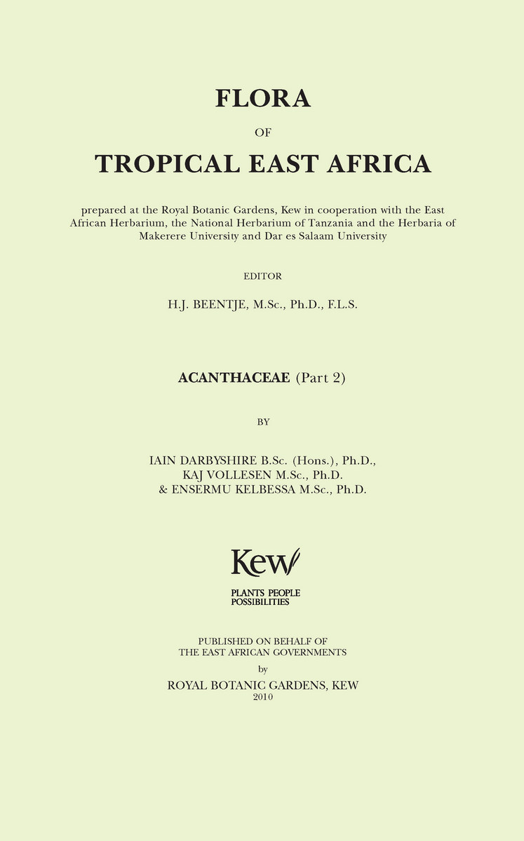 A descriptive account of the flowering plants and ferns native and naturalized in Kenya, Tanzania, and Uganda, together with information on exotic ornamental and crop plants. At least one species per genus is illustrated, and the bibliography and synonymy are sufficiently detailed to explain the nomenclature and taxonomic circumscriptions within a broad regional context. The Flora is a part work published in fascicles (paperback).
